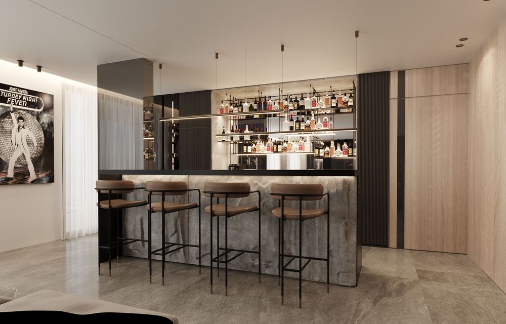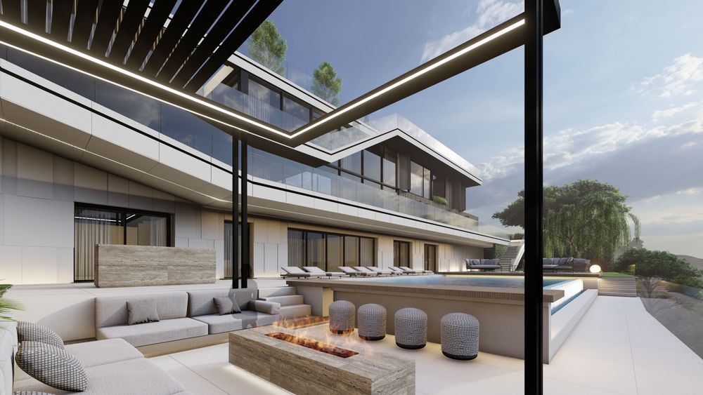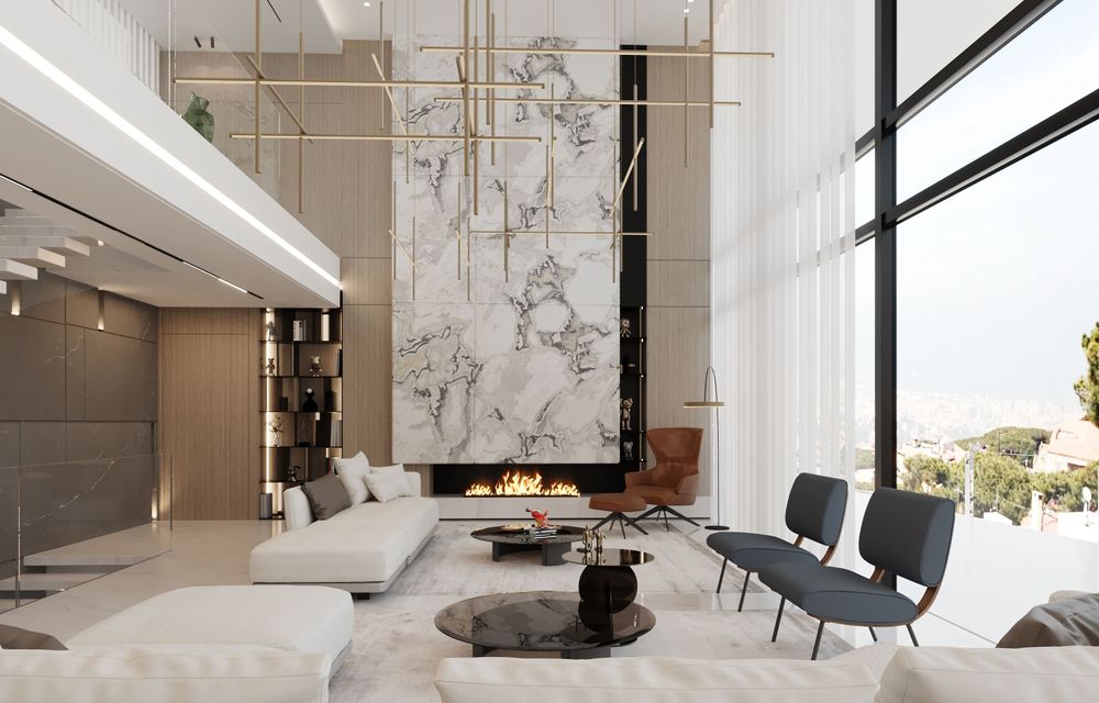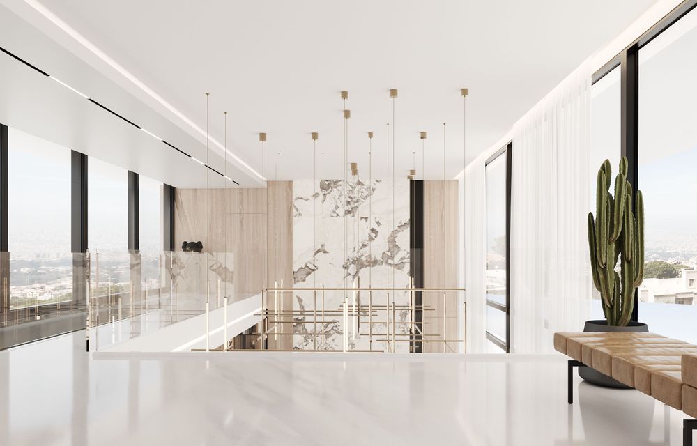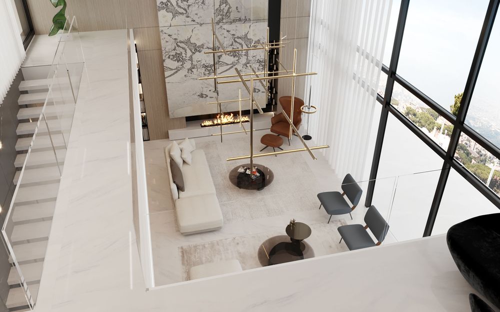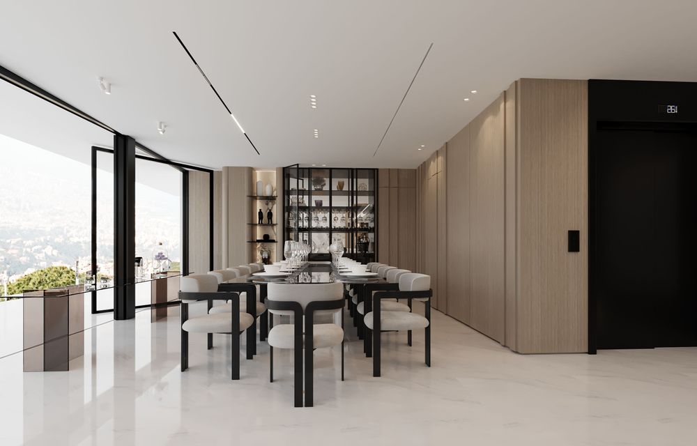 This luxurious triplex villa, nestled in the mountains, offers a serene escape with breathtaking views. Upon entering, the enchanting lobby leads you down to a double-height salon, highlighted by a stunning dove-white marble chimney and a striking floating staircase. The villa features five master bedrooms, spacious kitchens, and a captivating basement that entertains guests with a designer billiard table, seating area, and bar, all overlooking the infinity pool.
