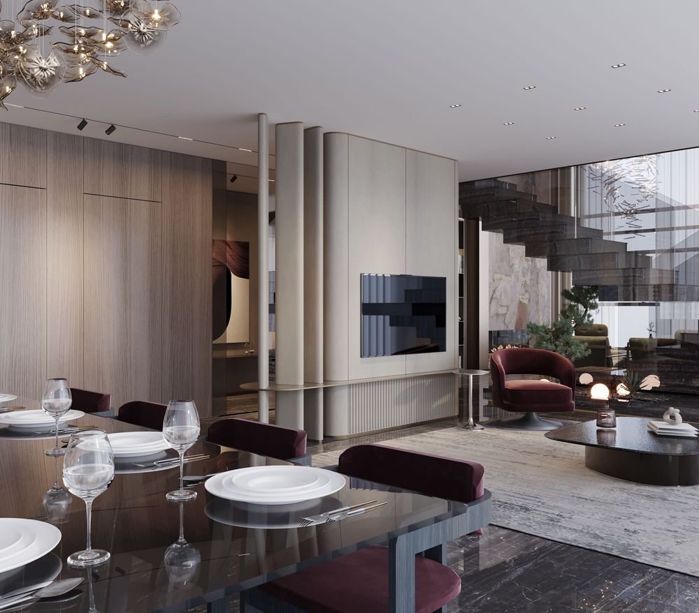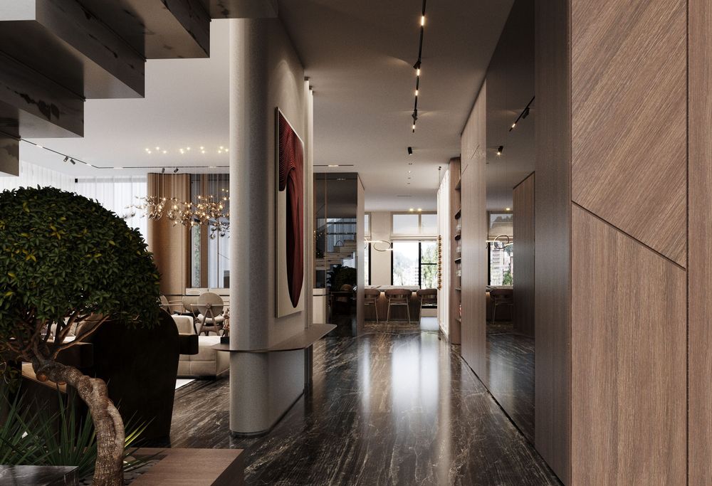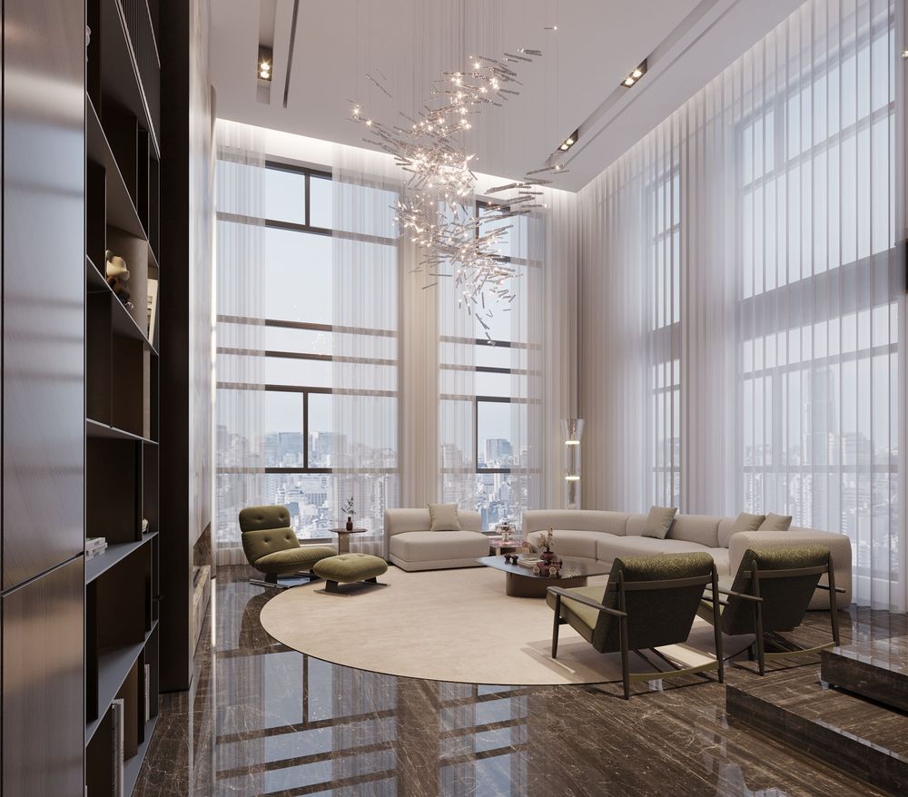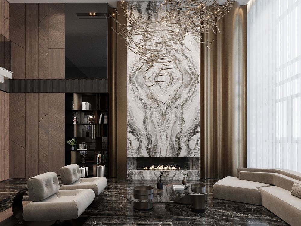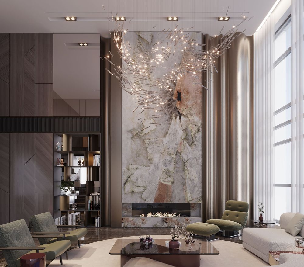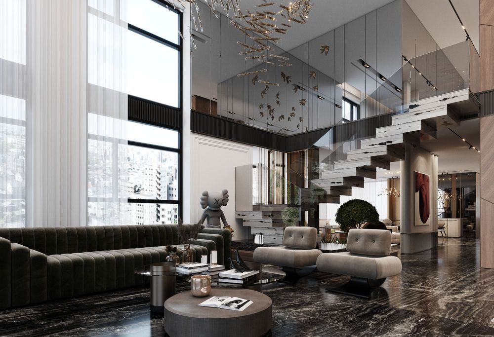 This luxurious duplex features a striking double-height living area, where expansive mirrors enhance the grandeur, reflecting rich walnut wood details and exotic marble accents. Bold brass elements are thoughtfully integrated into the design, accentuating the strong contrasts that give the space a captivating visual depth. Elegantly crafted luxury furniture combines comfort with sophistication, creating an inviting environment that speaks to timeless elegance and refined style.