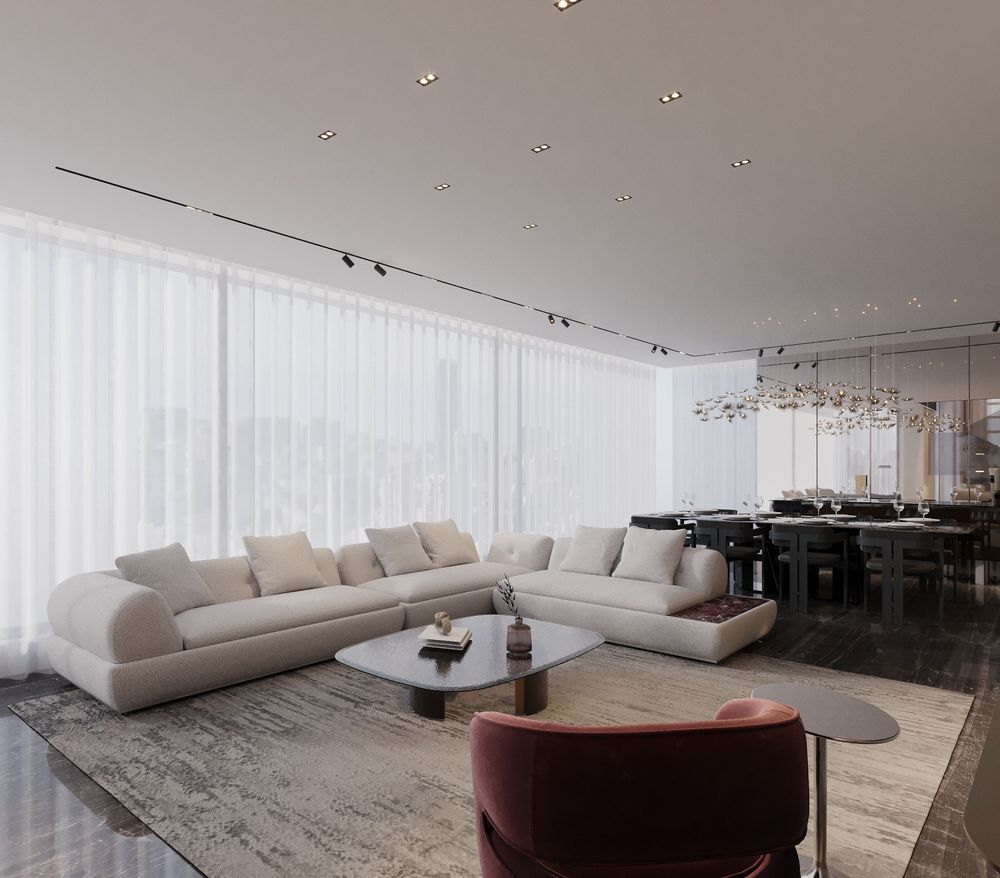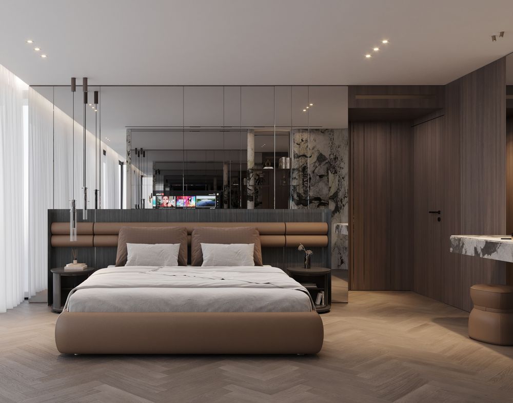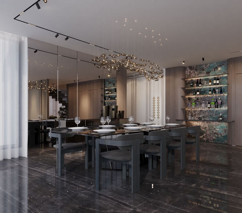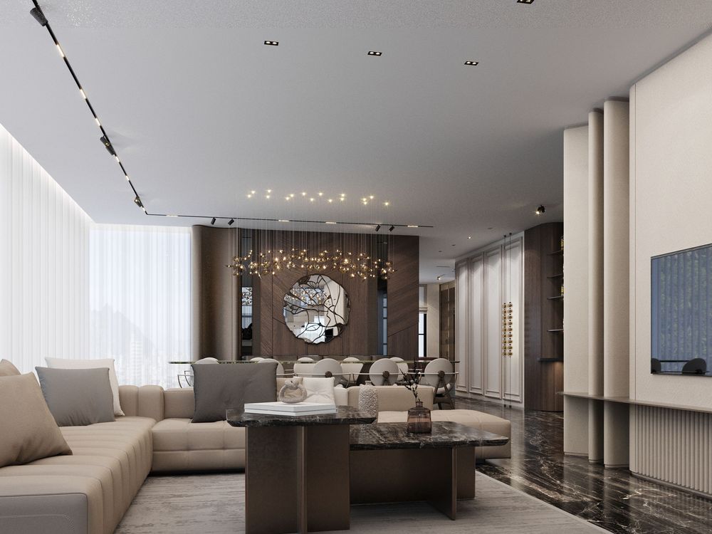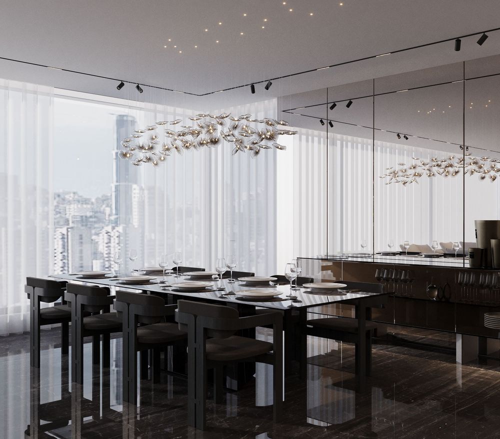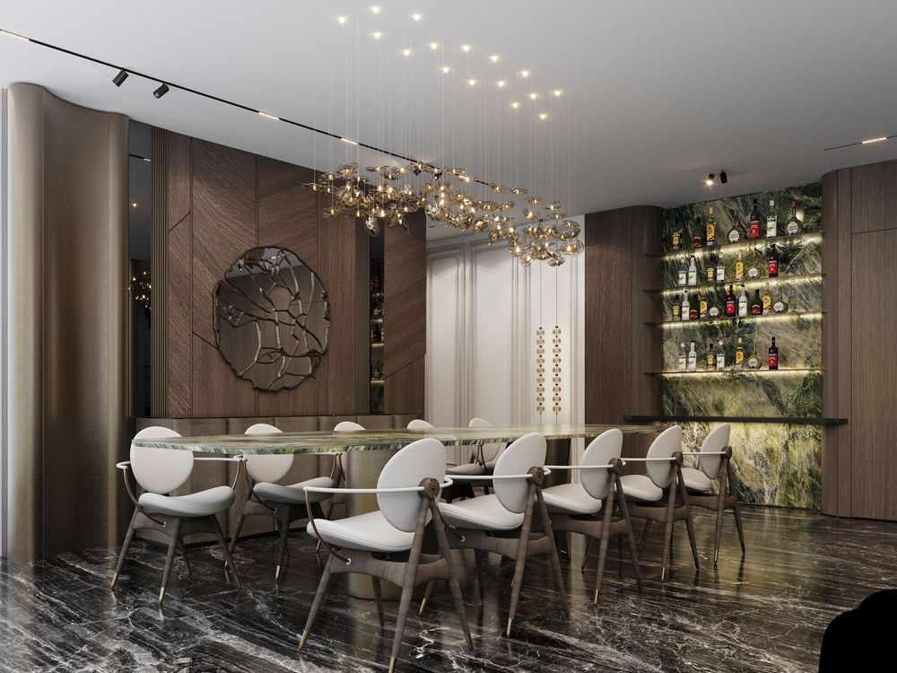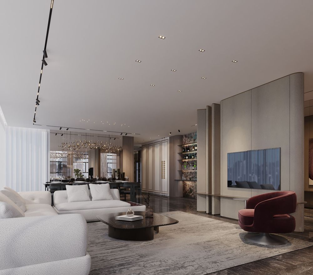 This luxurious duplex features a striking double-height living area, where expansive mirrors enhance the grandeur, reflecting rich walnut wood details and exotic marble accents. Bold brass elements are thoughtfully integrated into the design, accentuating the strong contrasts that give the space a captivating visual depth. Elegantly crafted luxury furniture combines comfort with sophistication, creating an inviting environment that speaks to timeless elegance and refined style.