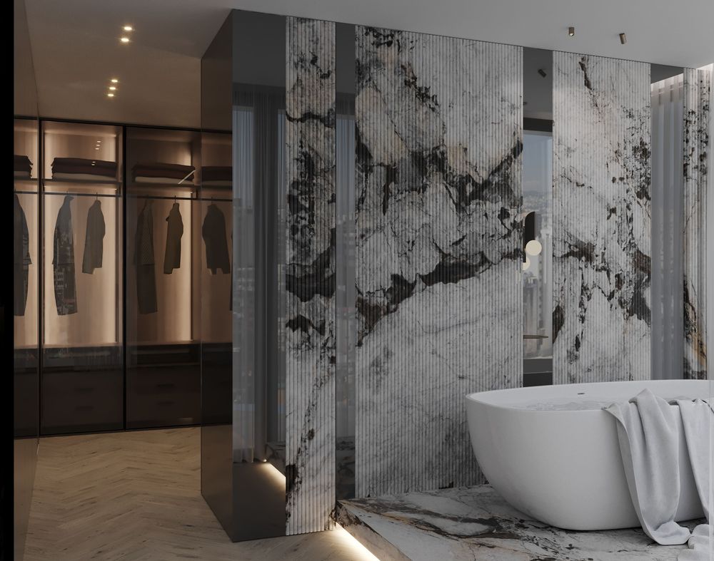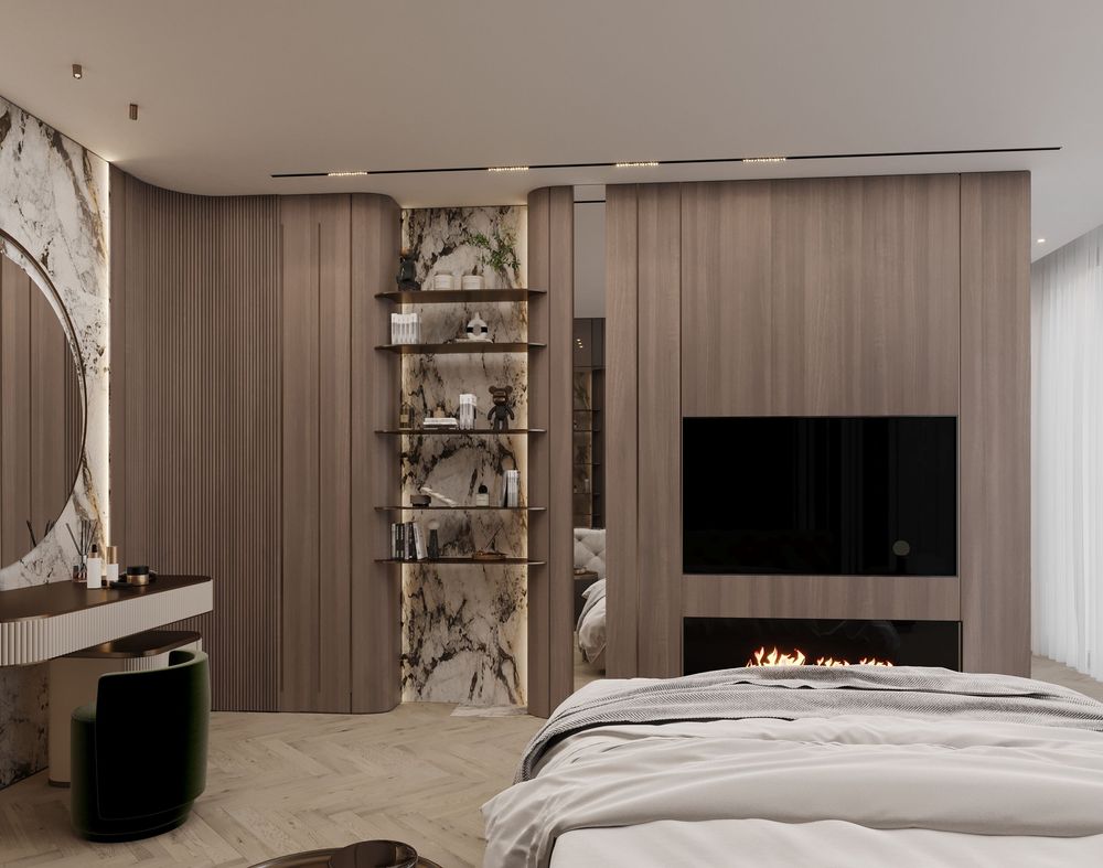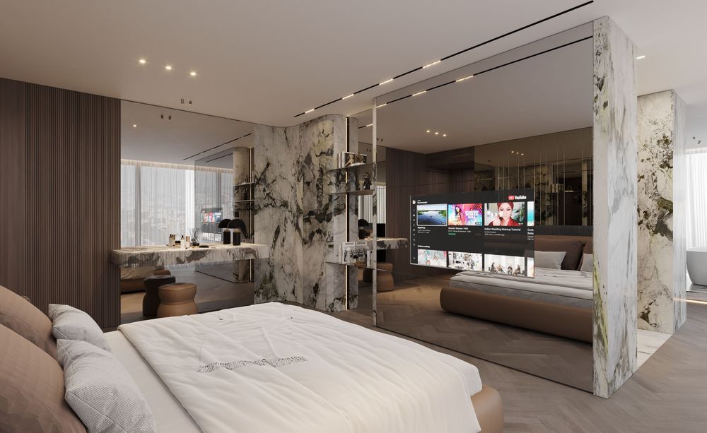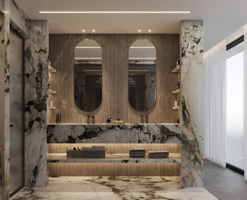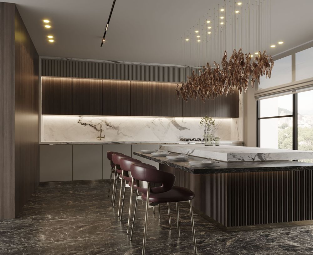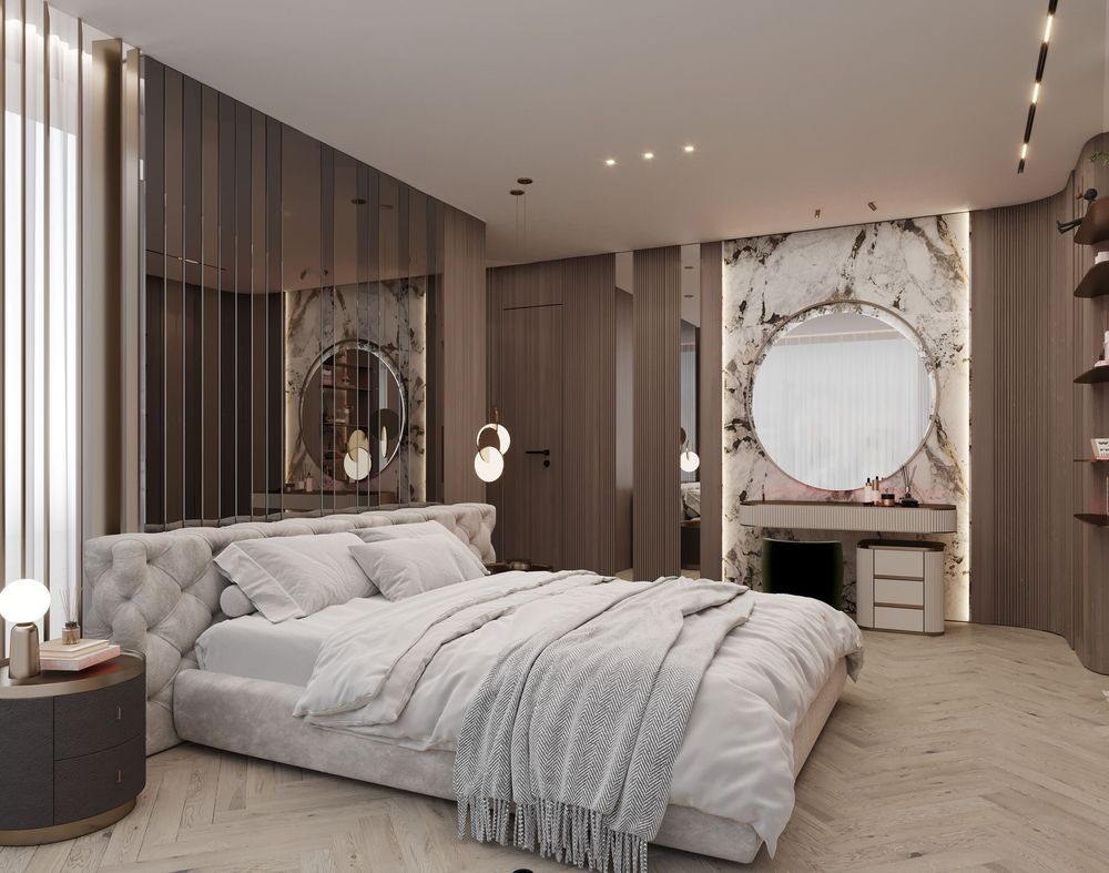 This luxurious duplex features a striking double-height living area, where expansive mirrors enhance the grandeur, reflecting rich walnut wood details and exotic marble accents. Bold brass elements are thoughtfully integrated into the design, accentuating the strong contrasts that give the space a captivating visual depth. Elegantly crafted luxury furniture combines comfort with sophistication, creating an inviting environment that speaks to timeless elegance and refined style.