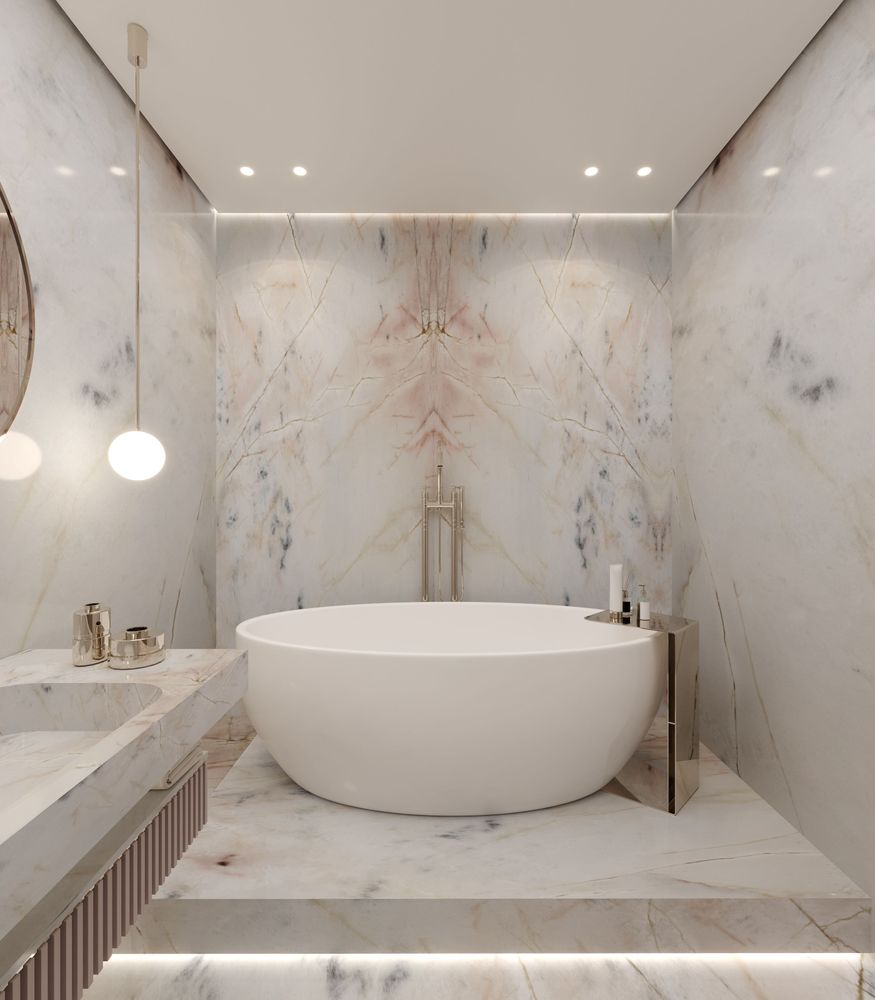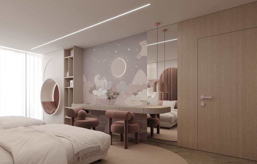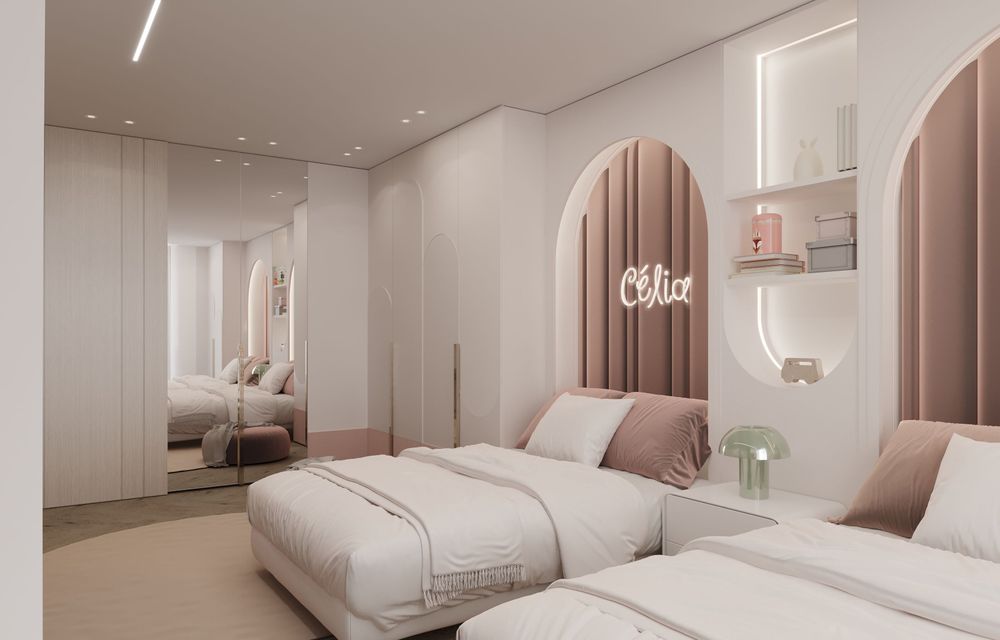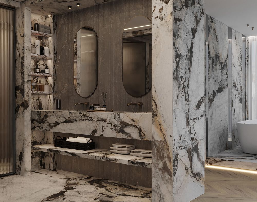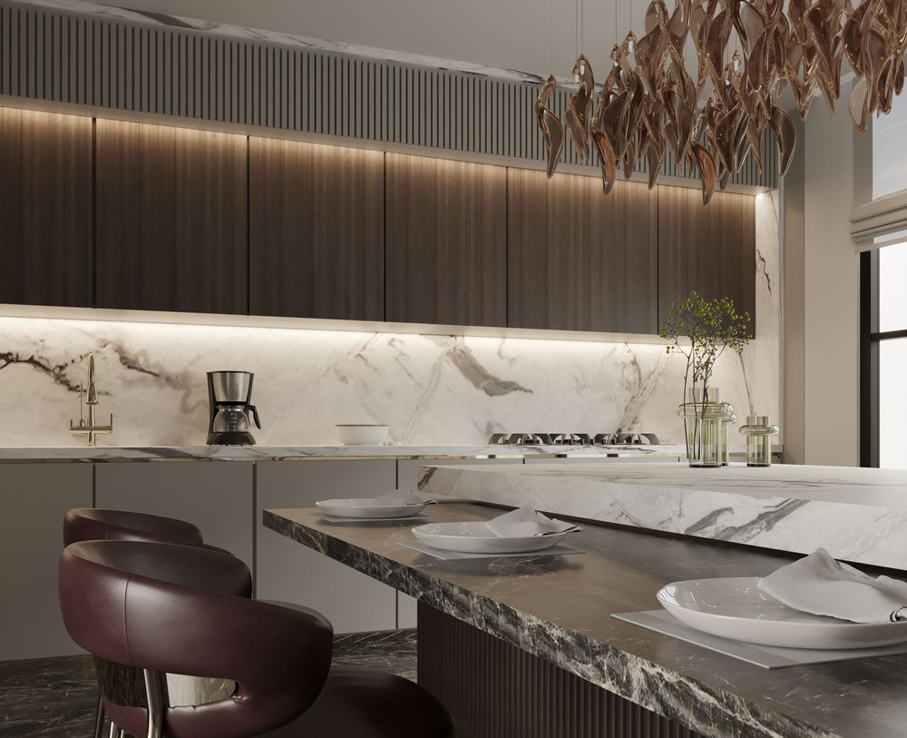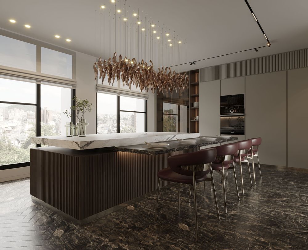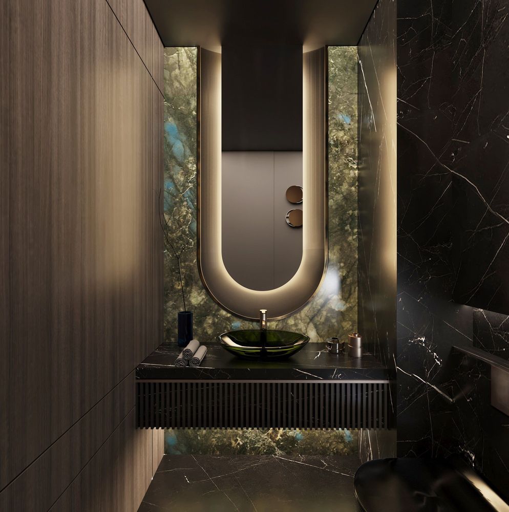 This luxurious duplex features a striking double-height living area, where expansive mirrors enhance the grandeur, reflecting rich walnut wood details and exotic marble accents. Bold brass elements are thoughtfully integrated into the design, accentuating the strong contrasts that give the space a captivating visual depth. Elegantly crafted luxury furniture combines comfort with sophistication, creating an inviting environment that speaks to timeless elegance and refined style.
